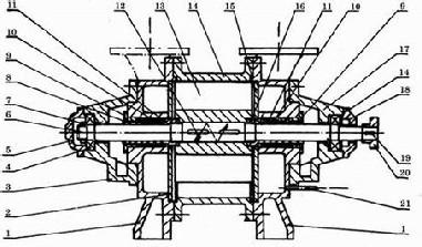 1.端盖 2.排气园盘 3.后轴承架 4.轴承 5.后轴承城市盖 6.轴 7.园螺母 8. 后轴套 9. 填料压盖 10.填料压圈 11.填料 12.平键 13. 叶轮 14.泵体 15.吸气园盘 16.前轴套 17.前轴承架18.前轴承压盖 19.平键 20.联轴器 21.进水管