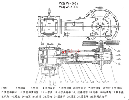气室和汽缸铸成整体,气室上面装有进气阀为进气口,气室下面装有排气阀为排气口,在阀的气槽上有阀片和螺旋弹簧组成逆止阀,以控制进排气和自动完成配气作用。